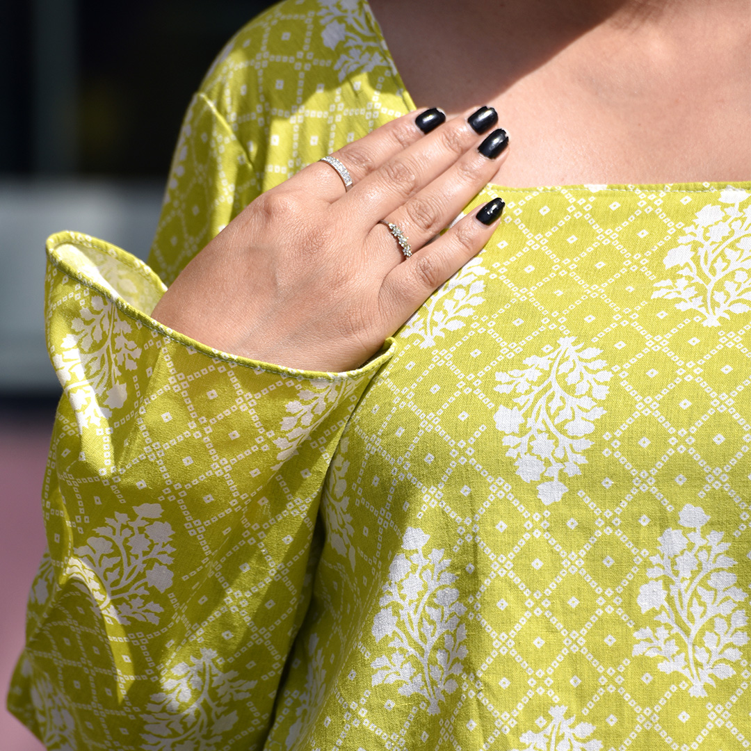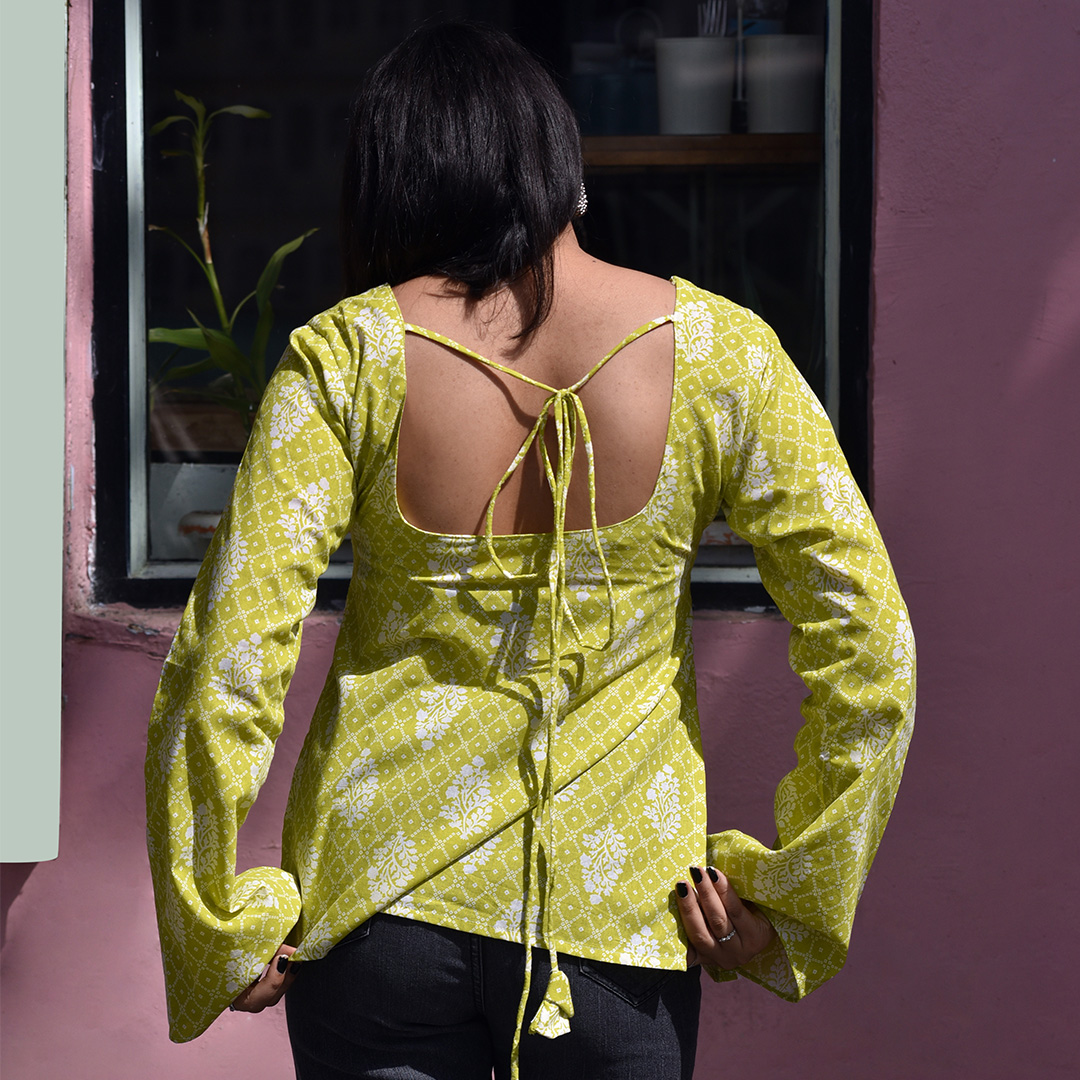 This Lime Green Handblock Printed Cotton Kurti features a refreshing and youthful handblock print pattern with white floral motifs over a geometric background. Crafted from soft, breathable cotton, it’s perfect for casual summer outings or relaxed festive wear. The design includes a square neckline on the front for a contemporary touch, a stylish open back with tie-up detailing that adds a hint of elegance and flair, and full bell sleeves that lend a flowy, bohemian vibe. Side slits ensure ease of movement and a flattering fit. Pair it with jeans, palazzos, or cotton trousers for a chic Indo-western look—ideal for daytime gatherings, brunches, or casual office wear.