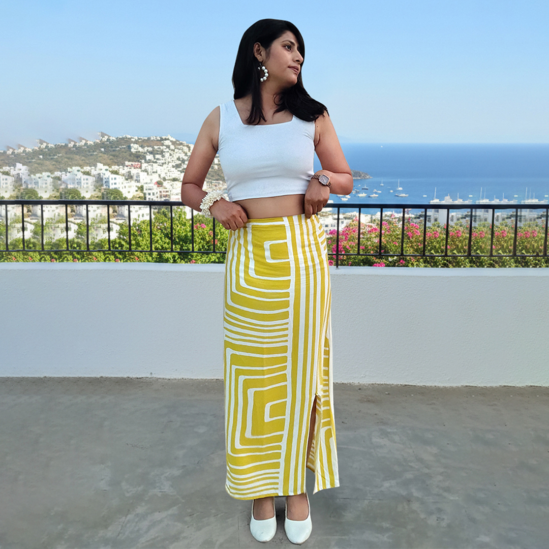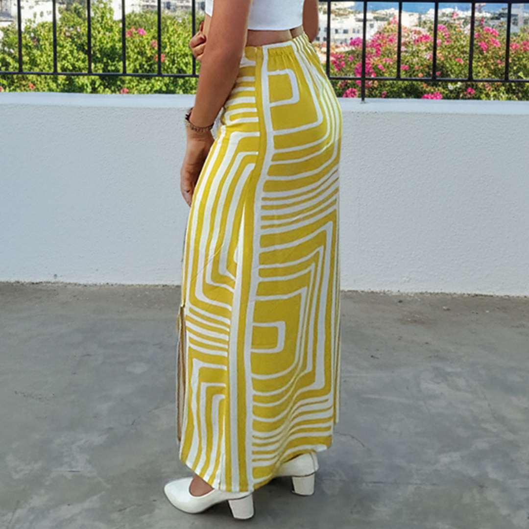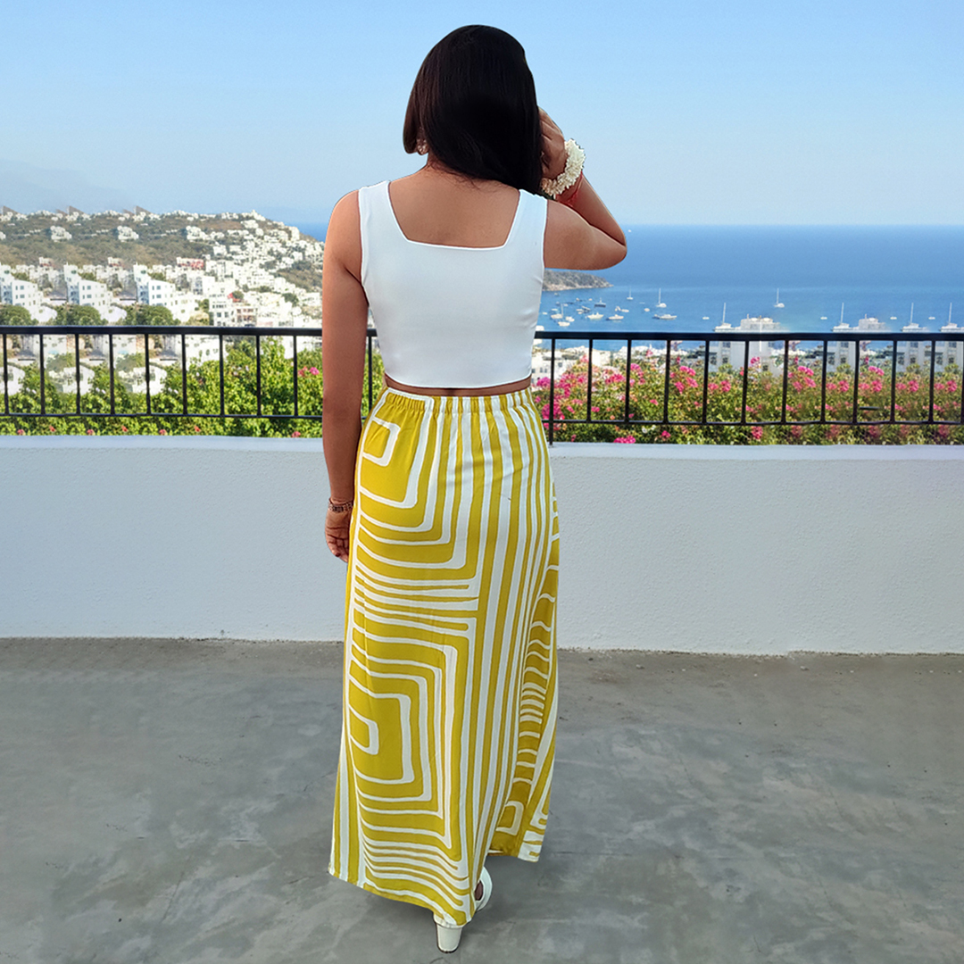 Crafted from lightweight, flowy fabric, this skirt features bold geometric stripes in white and yellow that add a chic, contemporary edge. The high-waisted fit flatters your silhouette, while the front slit ensures easy movement and a touch of allure. Perfect for brunch by the beach, summer getaways, or casual city strolls — it’s all about effortless elegance.